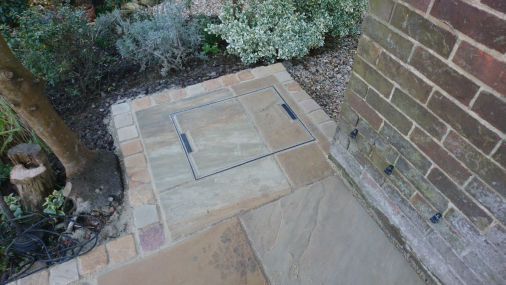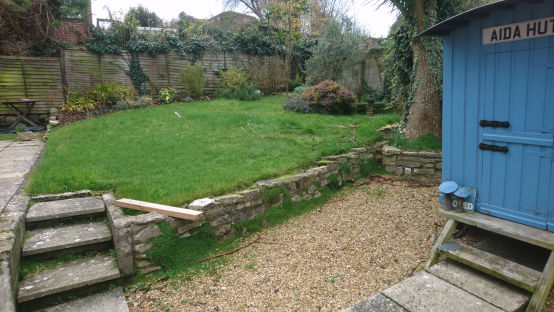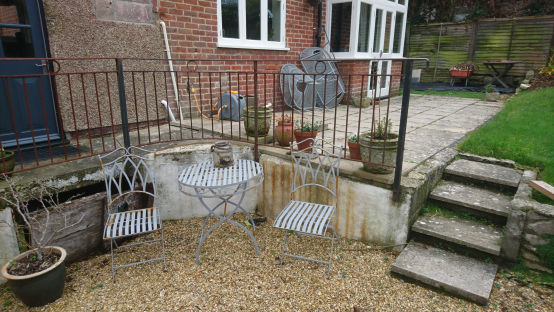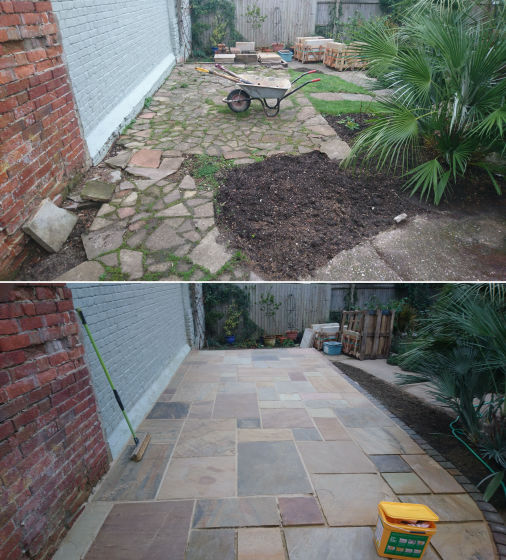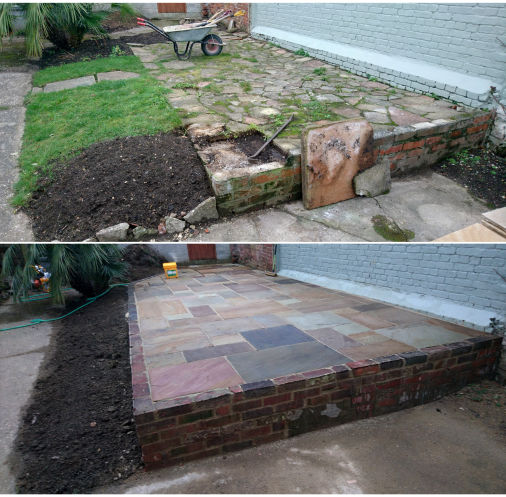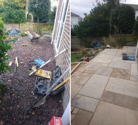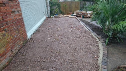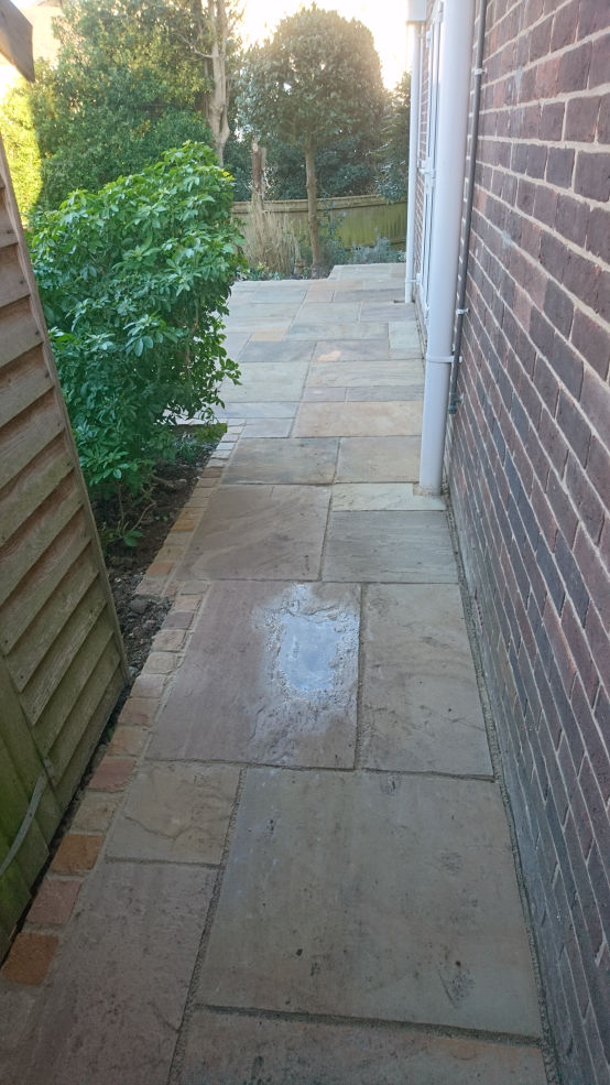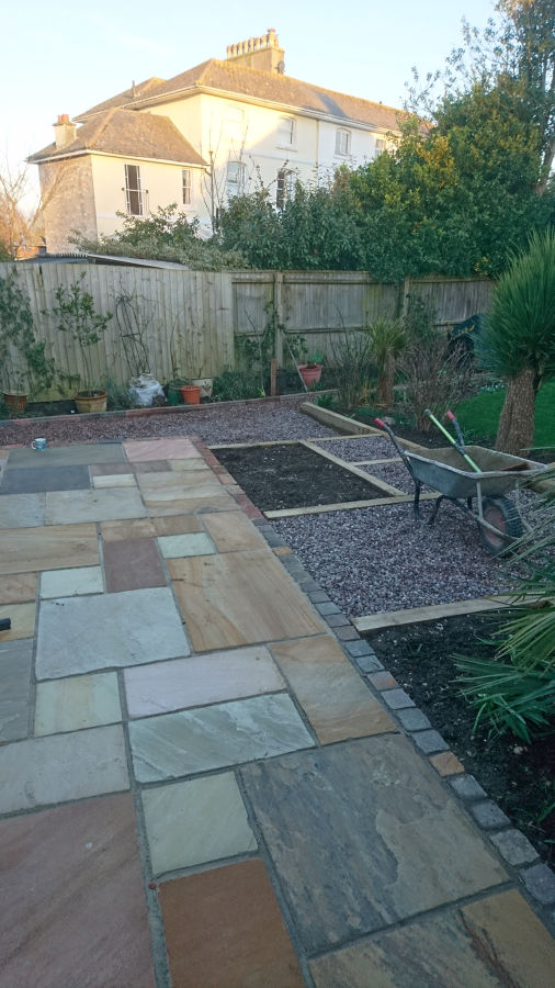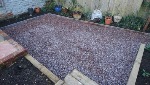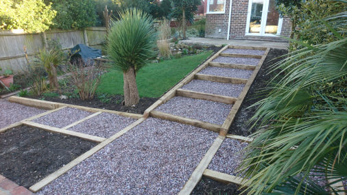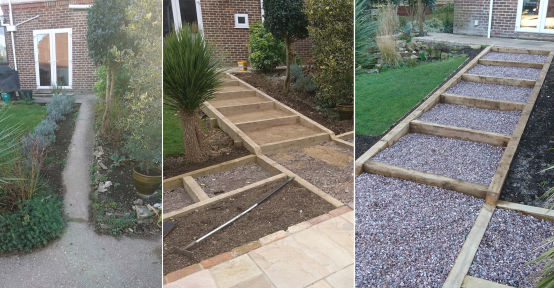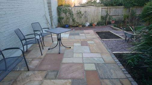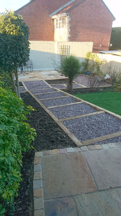 Complete renewal of pathways and patios in customer's garden. Patios were laid using Indian Sandstone and jointed with flexible colour matched compound. Pathways created using pressure treated sleepers, back filled with compacted hardcore and topped with 'Staffordshire Pink' gravel. Other smaller parts of the project included building up an old brick retaining wall at one corner and concreting in rope edges to a flower bed to retain gravel movement.