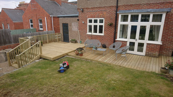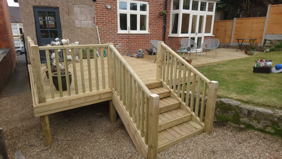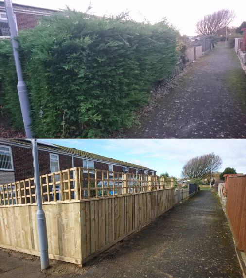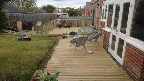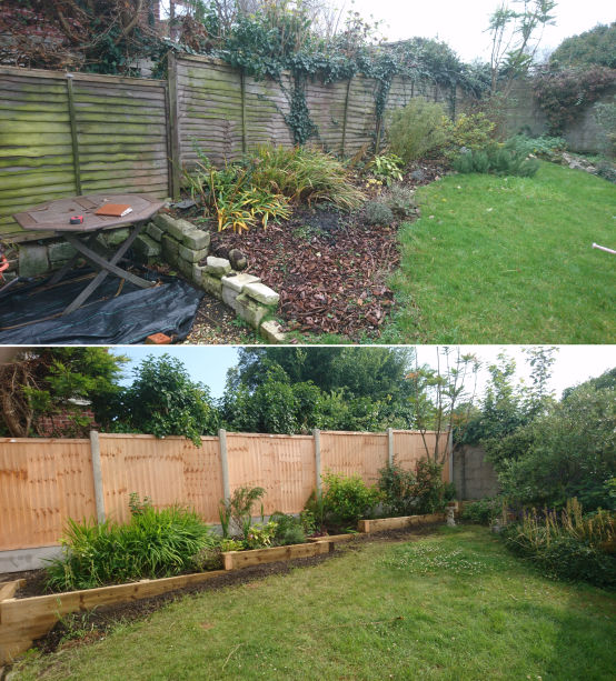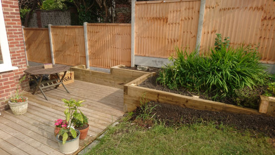 Here we replaced an old tired panel fence with a much more durable, concrete post and concrete gravel board fence which utilises slide in, lapped, timber panels. Raised beds were built to tidy up the beds at the back and around the far area of the decking. A large partially raised, deck was built that covered over some old, concrete steps and extended the useable area outside the back door of the house.